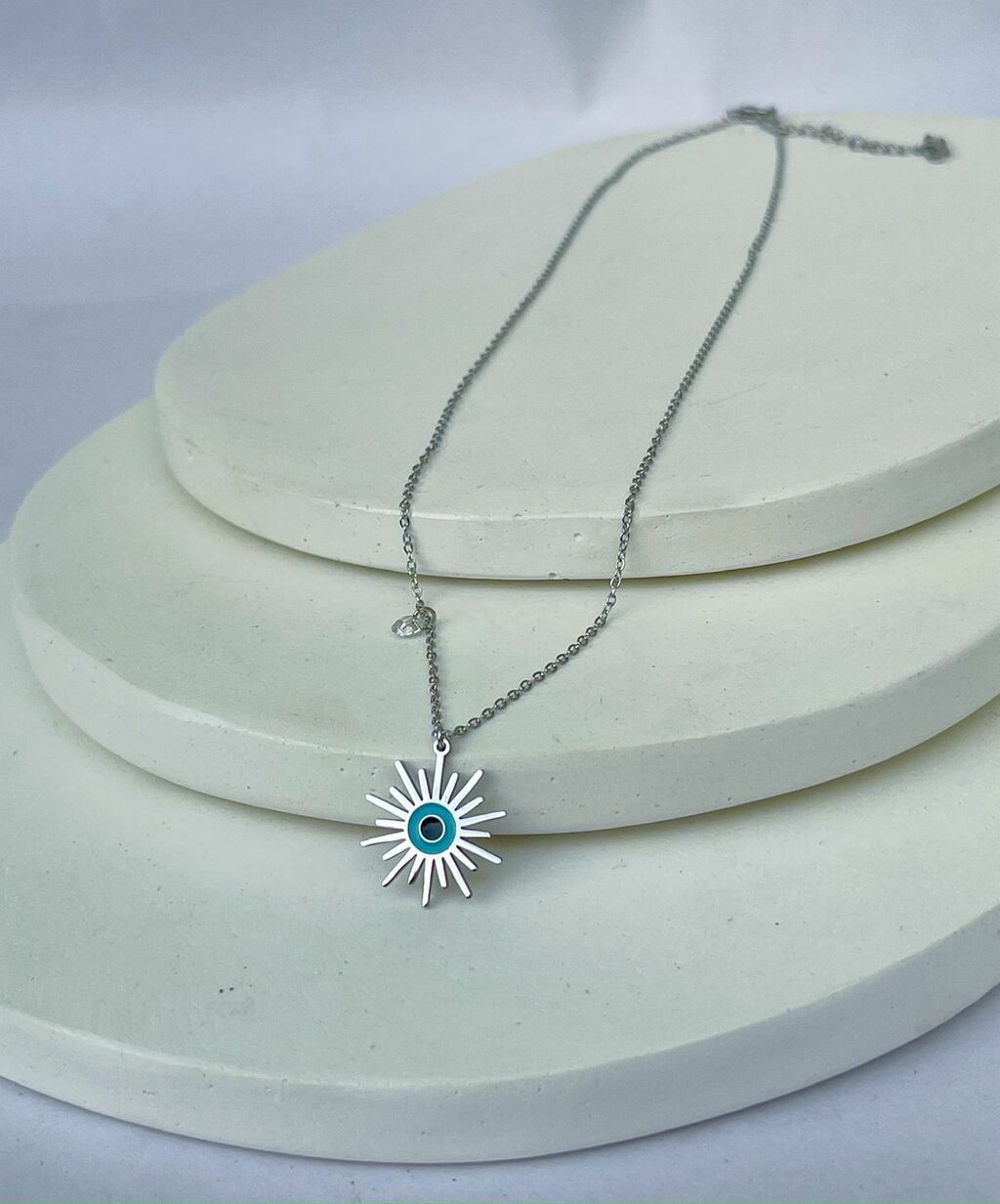 Modelo: Colar com pingente duplo de raios de sol e olho grego, e ponto de luz.